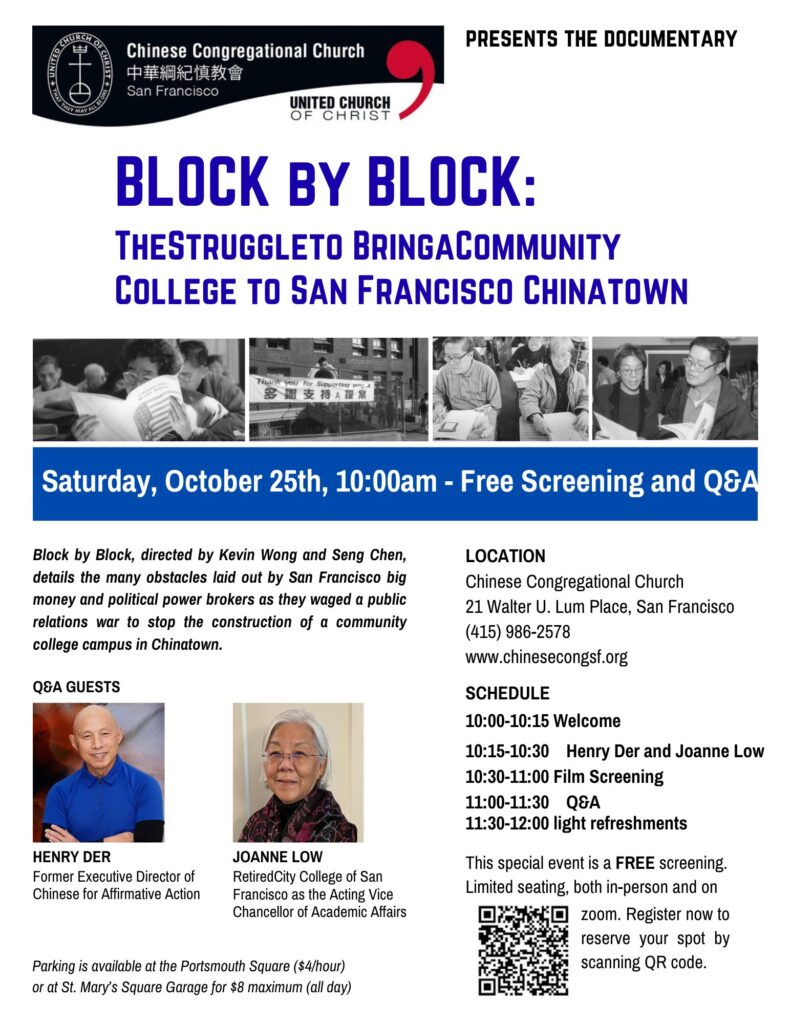 Block by Block, directed by Kevin Wong and Seng Chen, details the many obstacles laid out by San Francisco big money and political power brokers as they waged a public relations war to stop the construction of a community college campus in Chinatown. This special event is a FREE community screening. Limited seating, in-person and on Zoom. Register now to reserve your spot.